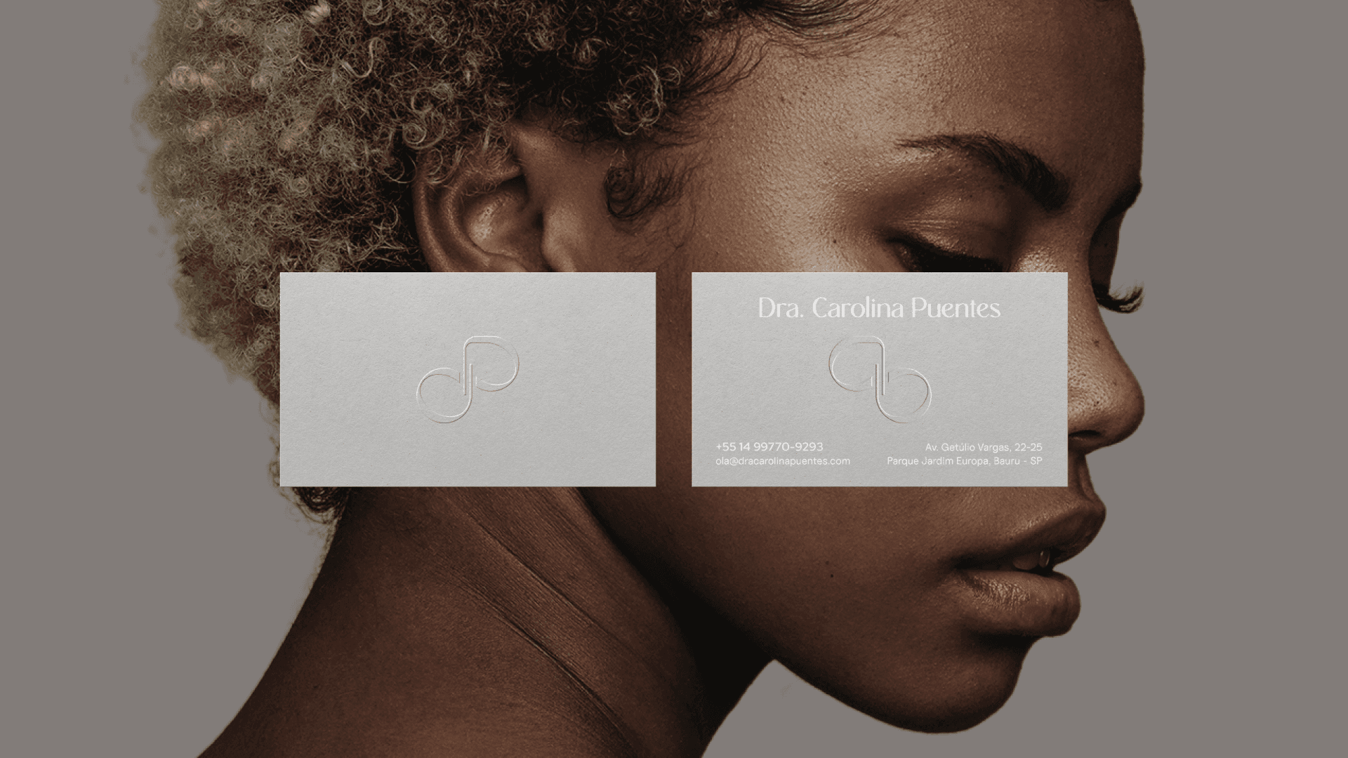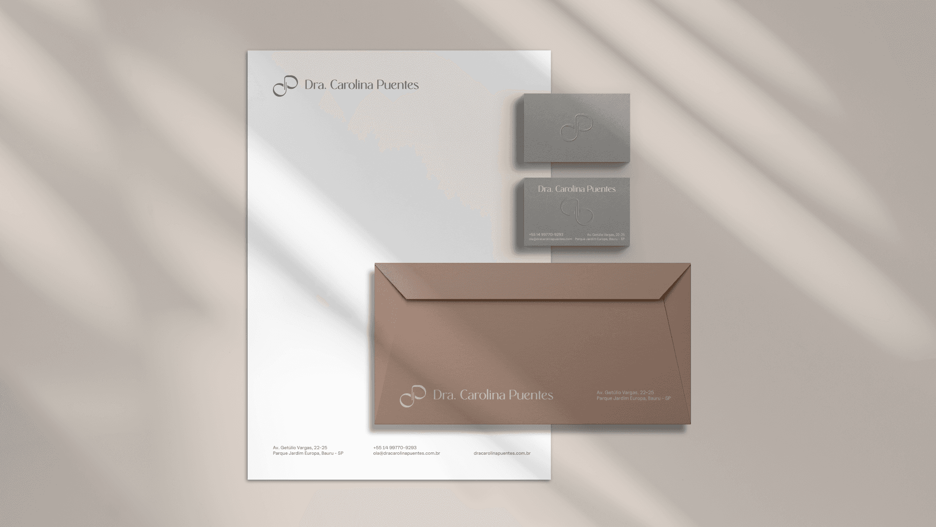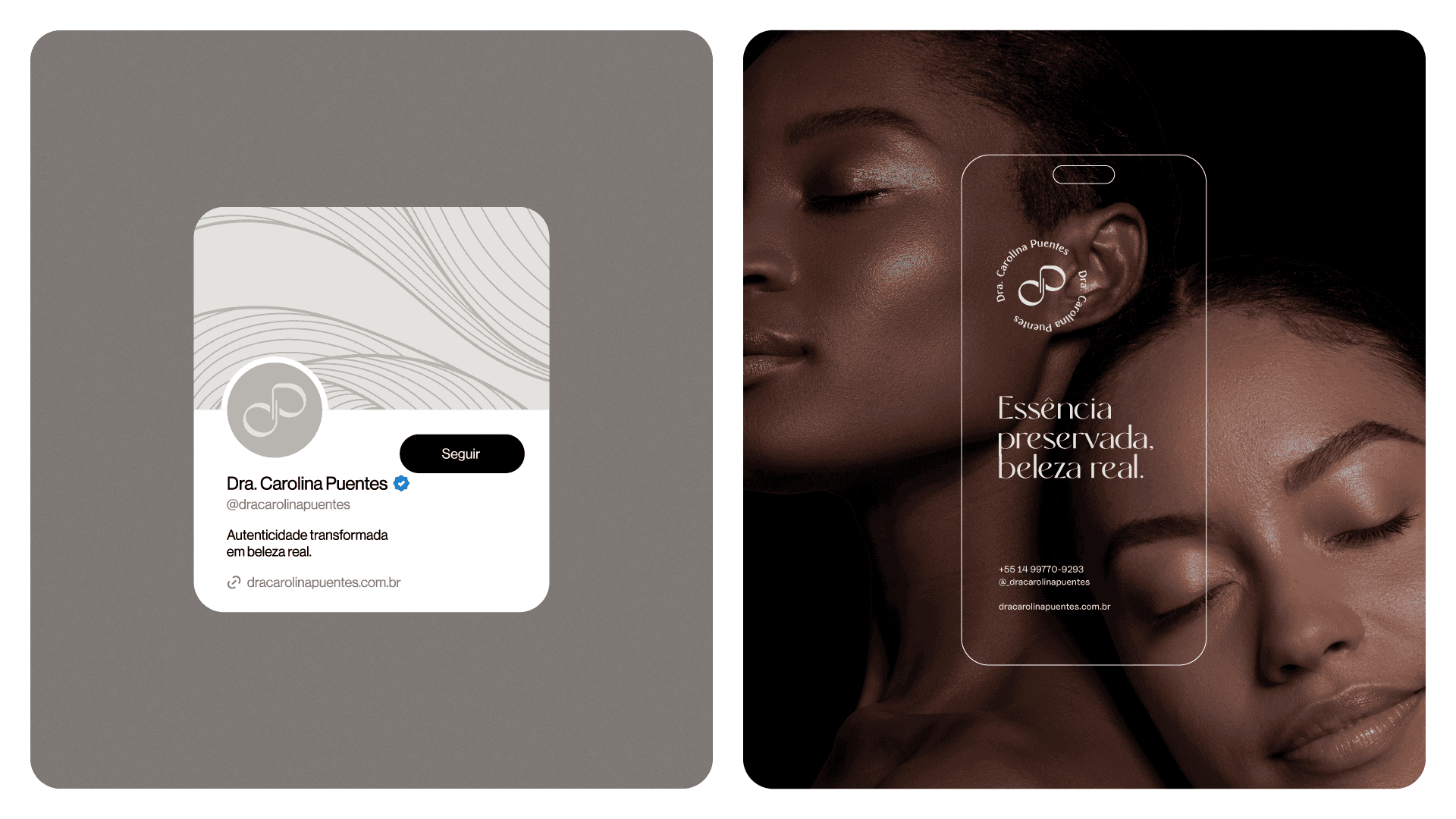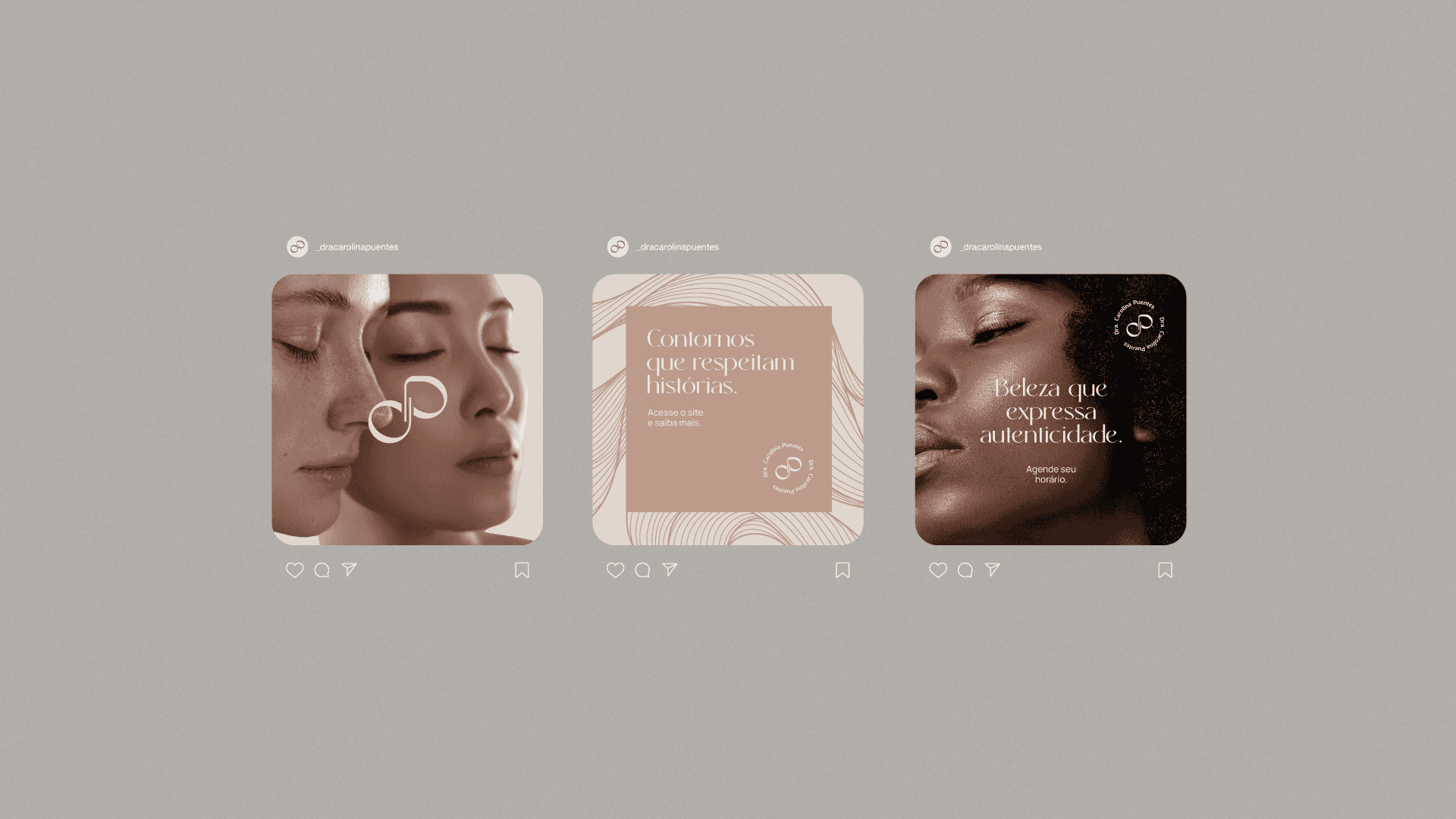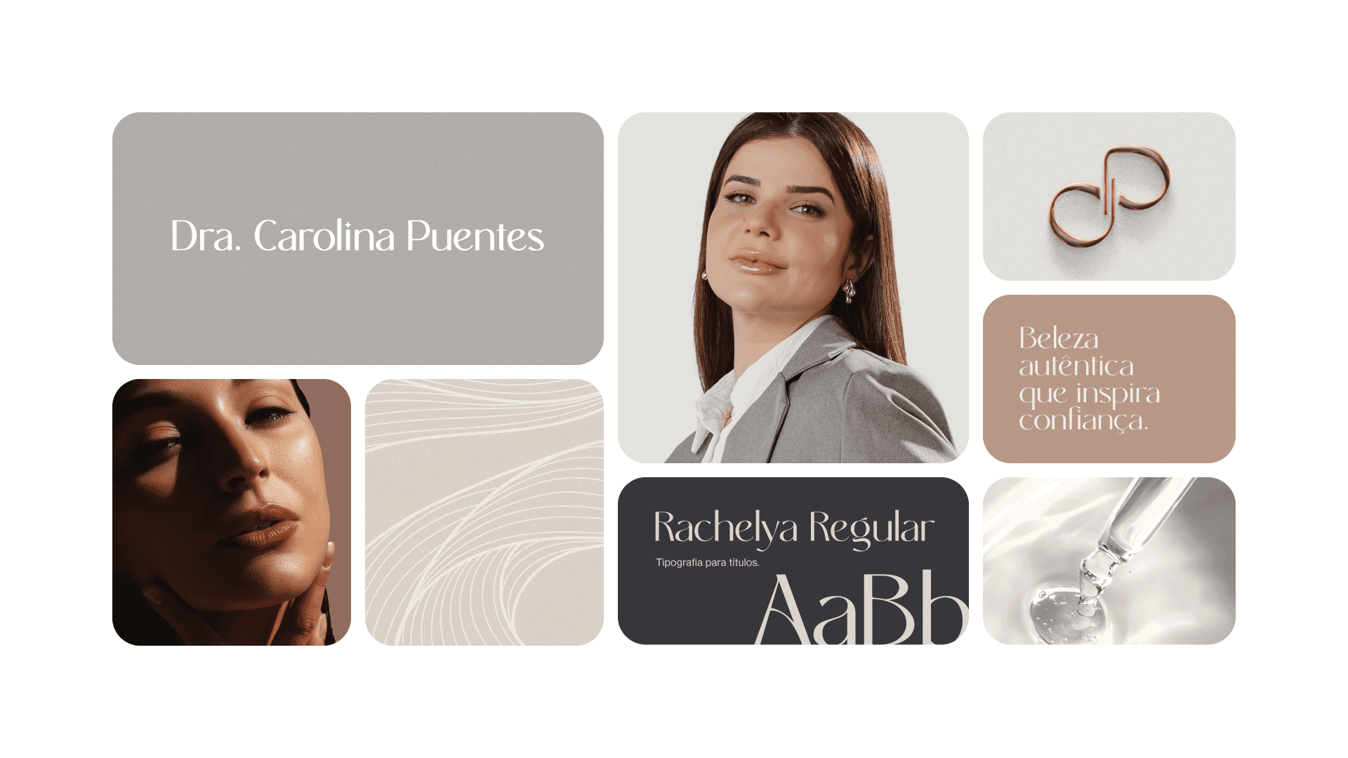 The visual identity of Dr. Carolina Puentes embodies the balance between technique and sensitivity. The color palette combines shades of gray and terracotta, symbolizing sophistication and warmth. Gray conveys professionalism and neutrality; terracotta, warmth and authenticity. The organic shapes present in the visual system were inspired by the logo symbol and the natural lines of human faces. They reinforce the idea of unique beauty, translating Dr. Carolina's sensitive and personalized perspective. The Rachelya and Uncut Sans typefaces bring refinement and clarity to the identity, while Quentin evokes handwriting and adds a human touch to the brand, a combination that balances tradition and contemporaneity. These elements complement each other in a cohesive visual system that communicates exclusivity, empathy, and technical excellence in every detail.
