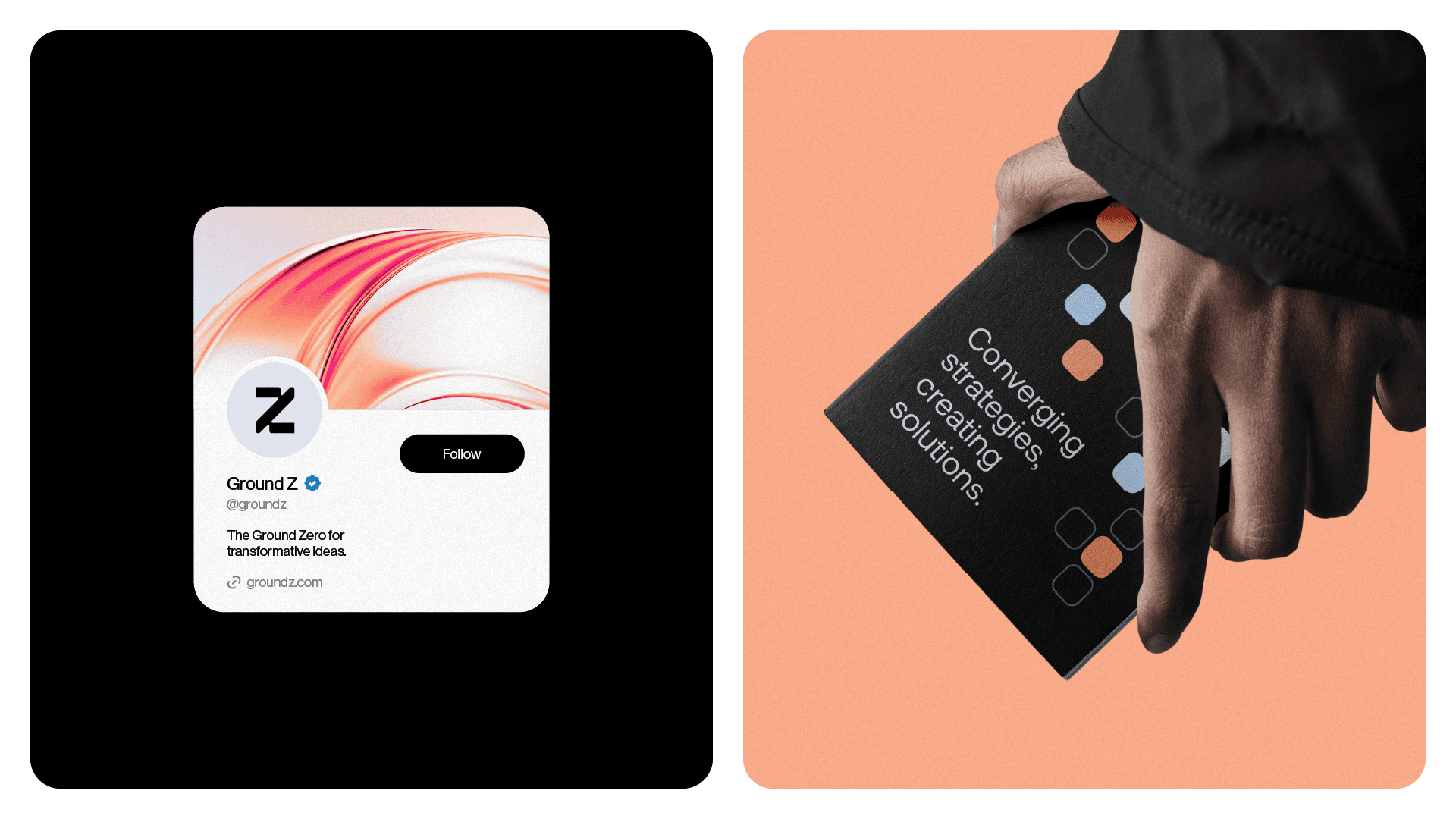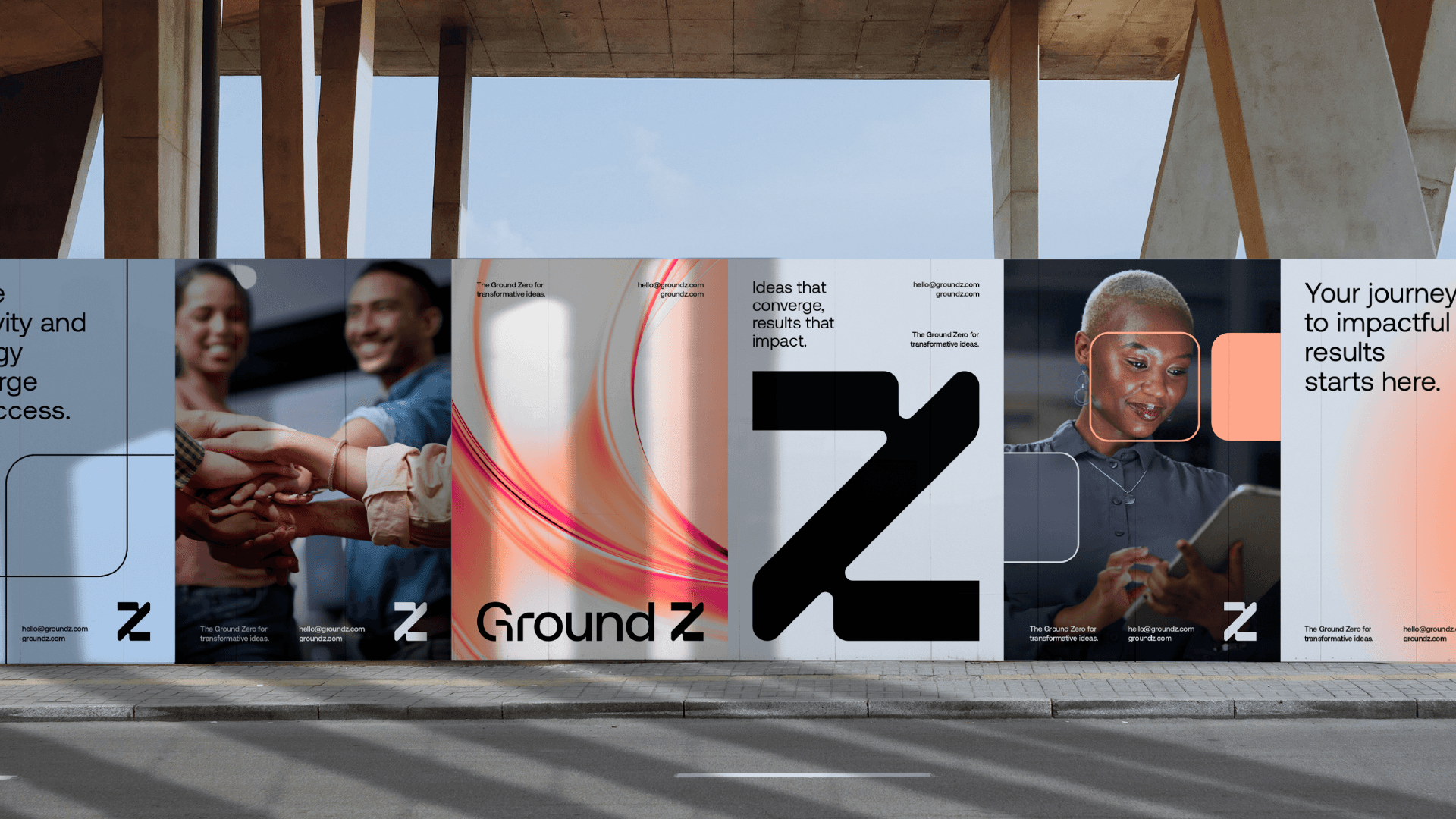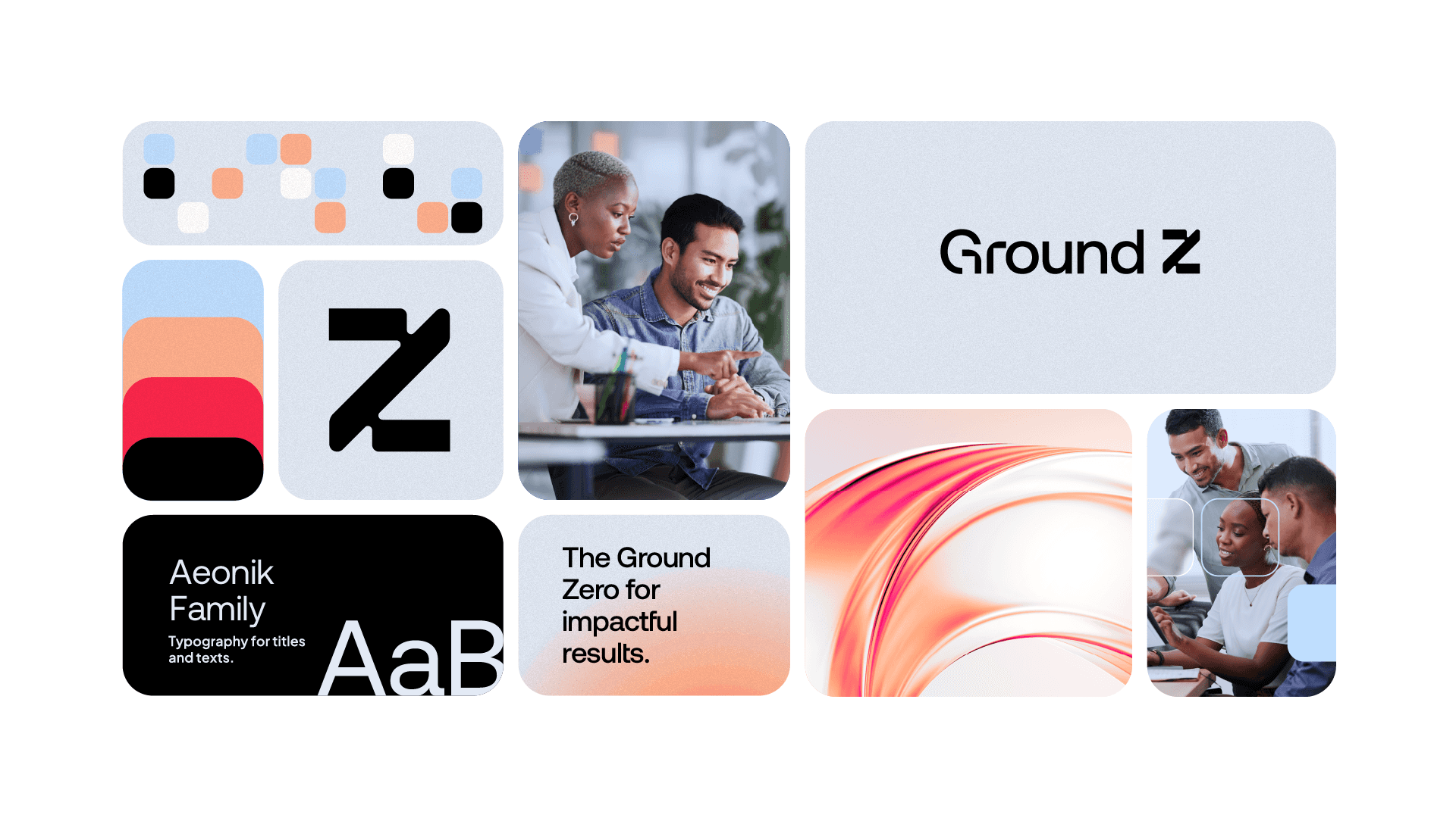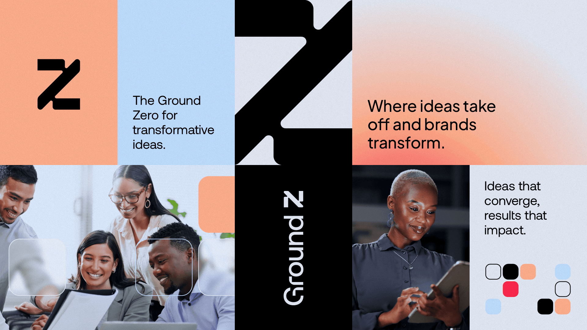 Ground Z's visual identity is based on modular shapes, fluid curves and well-structured compositions, graphically translating the brand's pillars. The color palette, composed of intense red, light orange, light blue and dark gray, balances energy, creativity and confidence. The ice tone and black serve as a base to highlight the main palette, maintaining sophistication and legibility. Graphic elements derived from the symbol are used to create flexible and functional layouts, which adapt to different formats without losing consistency. This approach generates a proprietary visual language, which conveys dynamism and reinforces Ground Z's role as a point of convergence between ideas and results.