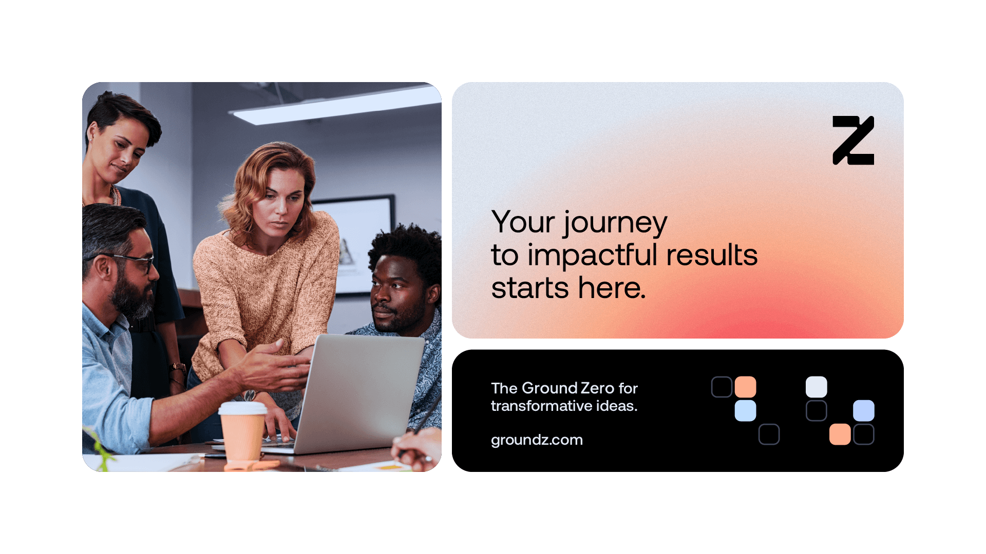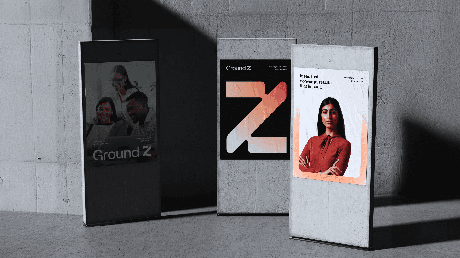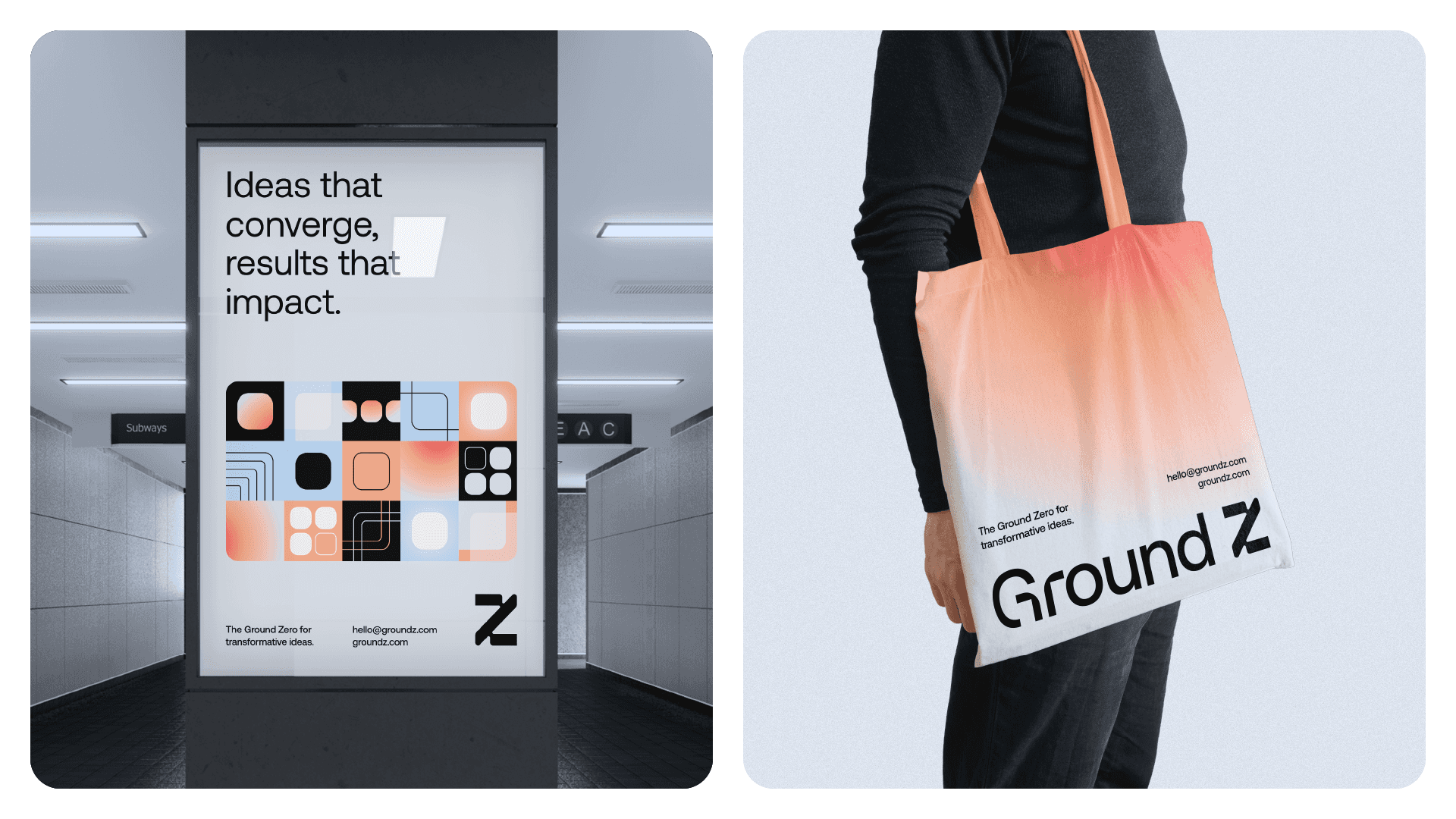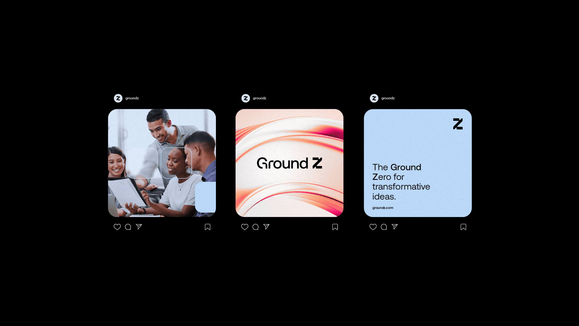 Ground Z's visual identity is based on modular shapes, fluid curves and well-structured compositions, graphically translating the brand's pillars. The color palette, composed of intense red, light orange, light blue and dark gray, balances energy, creativity and confidence. The ice tone and black serve as a base to highlight the main palette, maintaining sophistication and legibility. Graphic elements derived from the symbol are used to create flexible and functional layouts, which adapt to different formats without losing consistency. This approach generates a proprietary visual language, which conveys dynamism and reinforces Ground Z's role as a point of convergence between ideas and results.