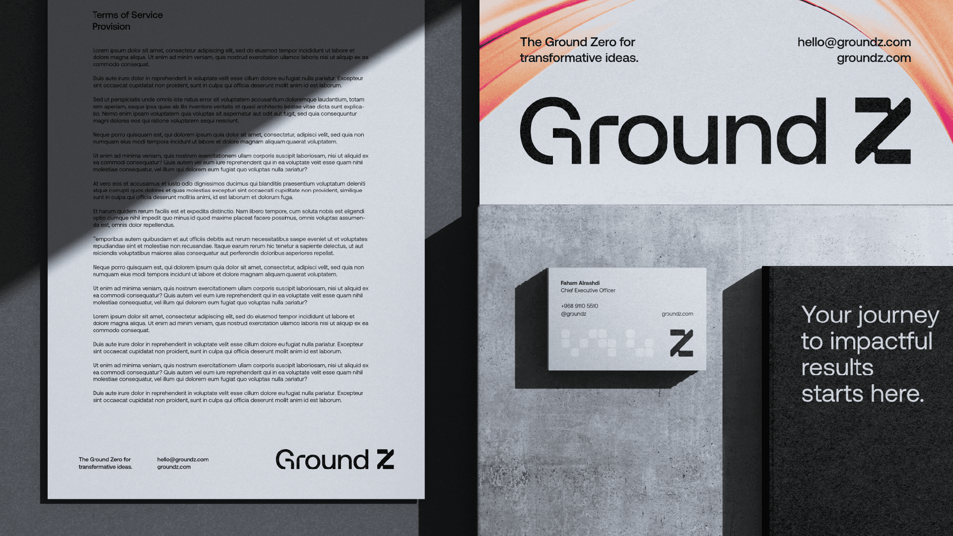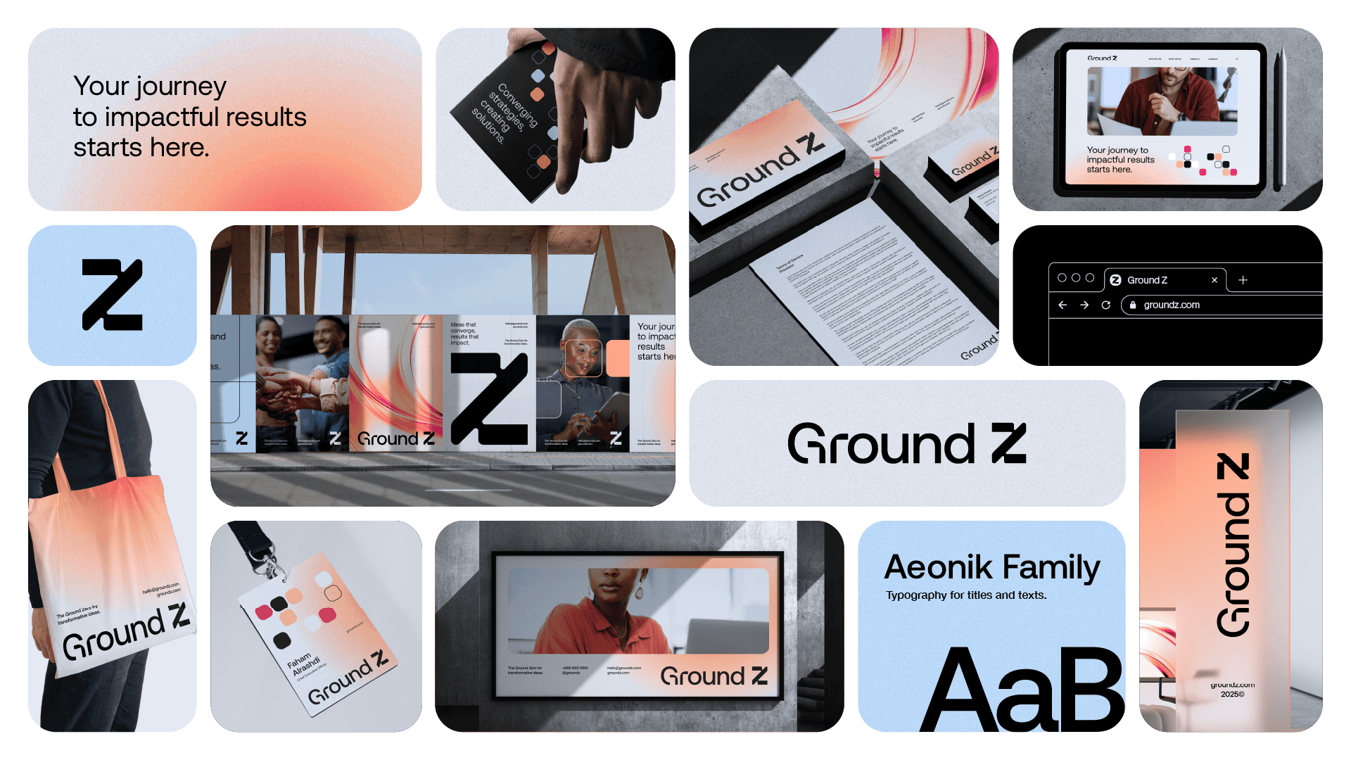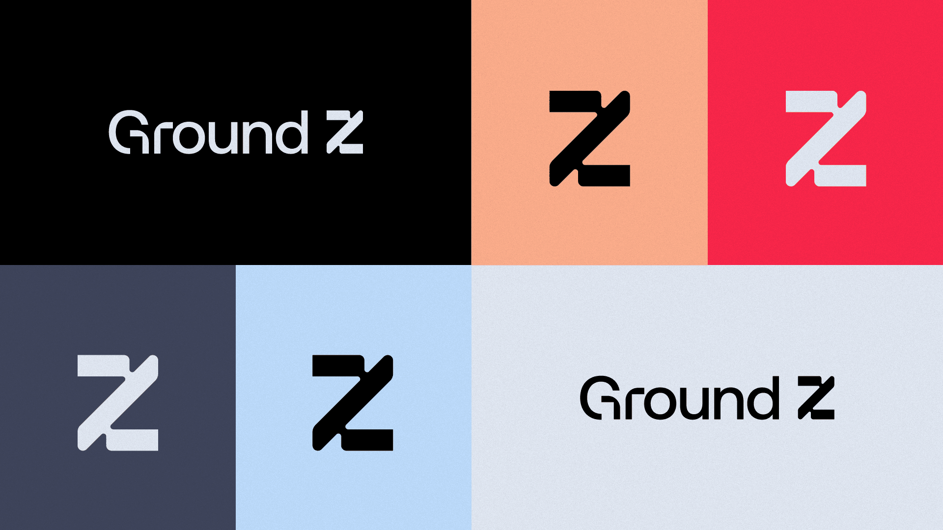 The Ground Z symbol is a modular Z, built from a geometric grid, with interconnected parts that represent planning, collaboration and continuous progress. The structure refers to the agency's strategic thinking, while the arrow shape embedded in the composition suggests direction, ascension and action. The sans serif typography, clear and objective, brings seriousness, modernity and precision to the brand. Its contrast with the symbol, more expressive and dynamic, creates a visual balance that reinforces the two sides of Ground Z: solid strategy and creativity in motion.