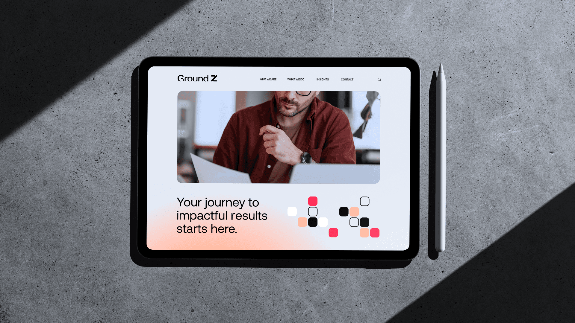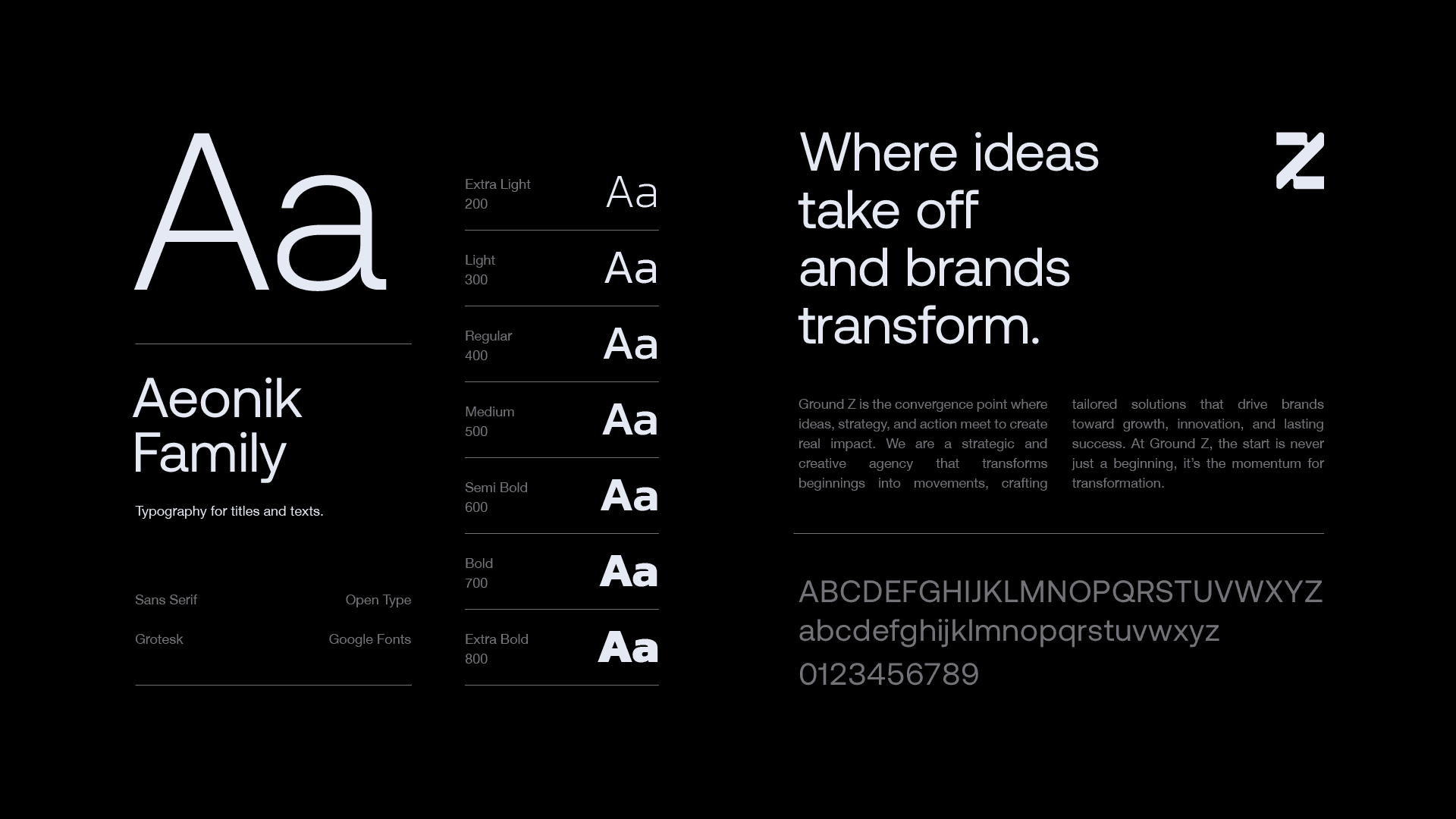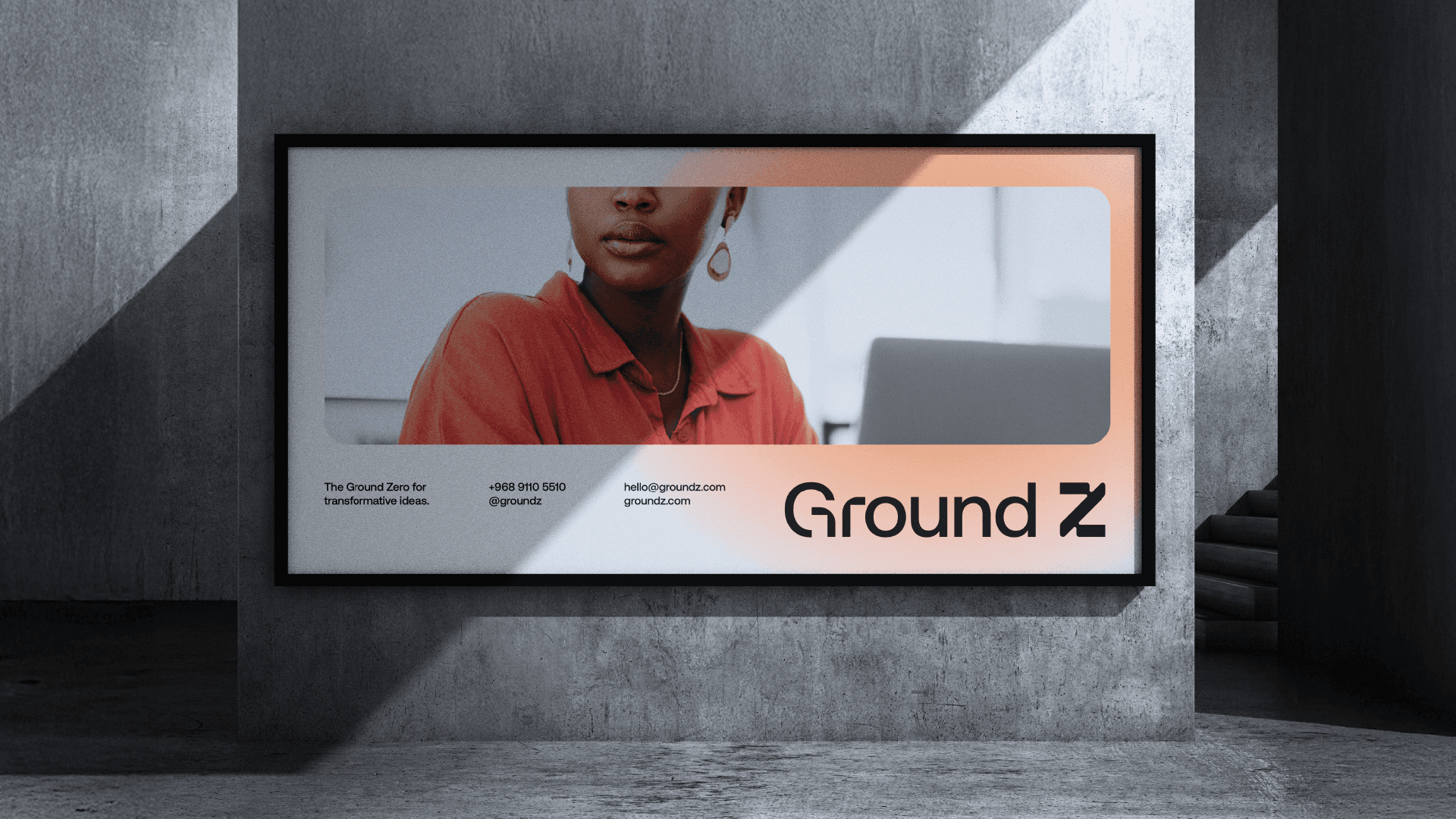 The Ground Z symbol is a modular Z, built from a geometric grid, with interconnected parts that represent planning, collaboration and continuous progress. The structure refers to the agency's strategic thinking, while the arrow shape embedded in the composition suggests direction, ascension and action. The sans serif typography, clear and objective, brings seriousness, modernity and precision to the brand. Its contrast with the symbol, more expressive and dynamic, creates a visual balance that reinforces the two sides of Ground Z: solid strategy and creativity in motion.