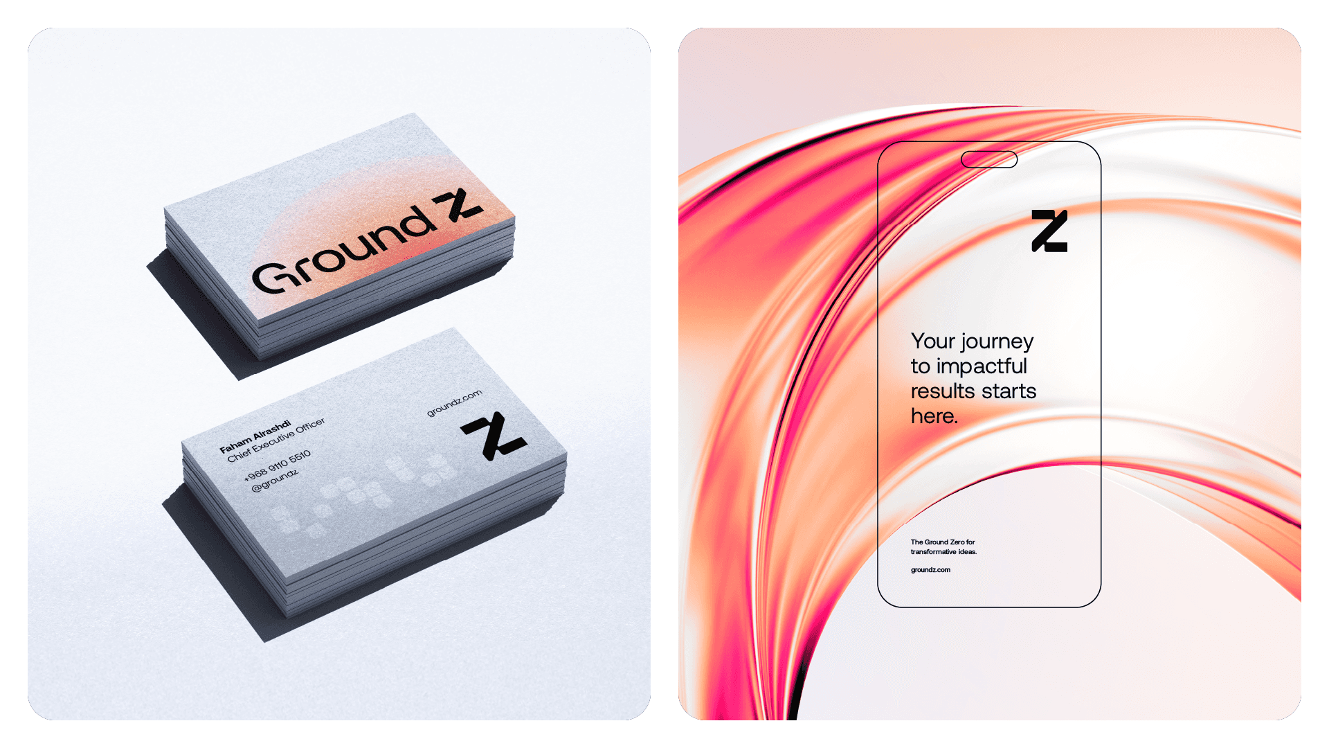 Ground Z’s visual identity was built based on the concept of “Zero Rising,” reflecting its role as a catalyst for movement, growth, and transformation. The project is based on the idea that every impactful result begins with a good starting point, and this is where Ground Z comes in: where strategy and creativity converge to give rise to progress. This essence is visually translated through elements that communicate fluidity, structure, and strategic energy, such as soft curves, vibrant gradients, multiplying squares, and clean, organized compositions. The identity strikes a balance between logic and visual expression, projecting the brand as solid, innovative, and in constant movement.