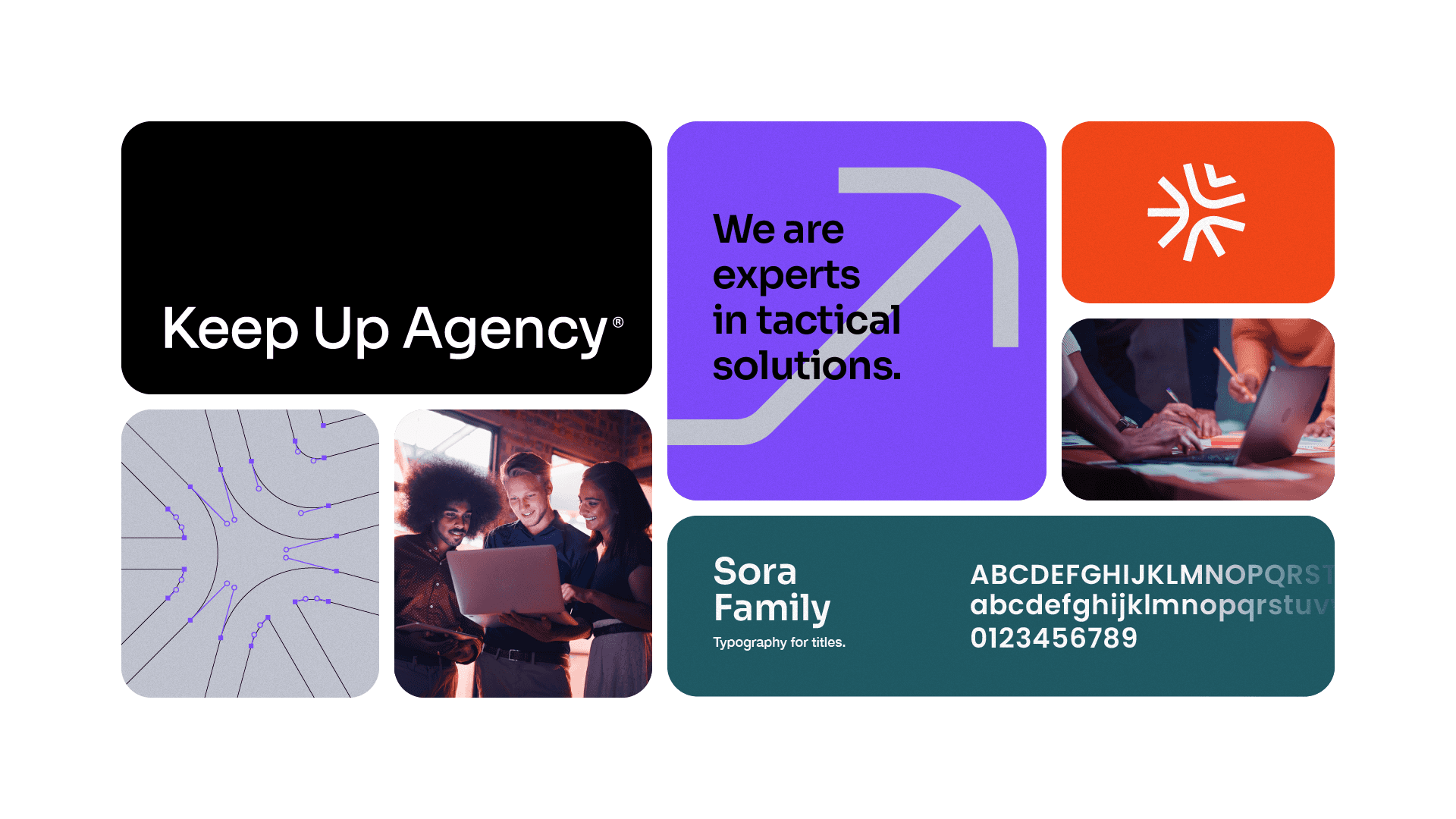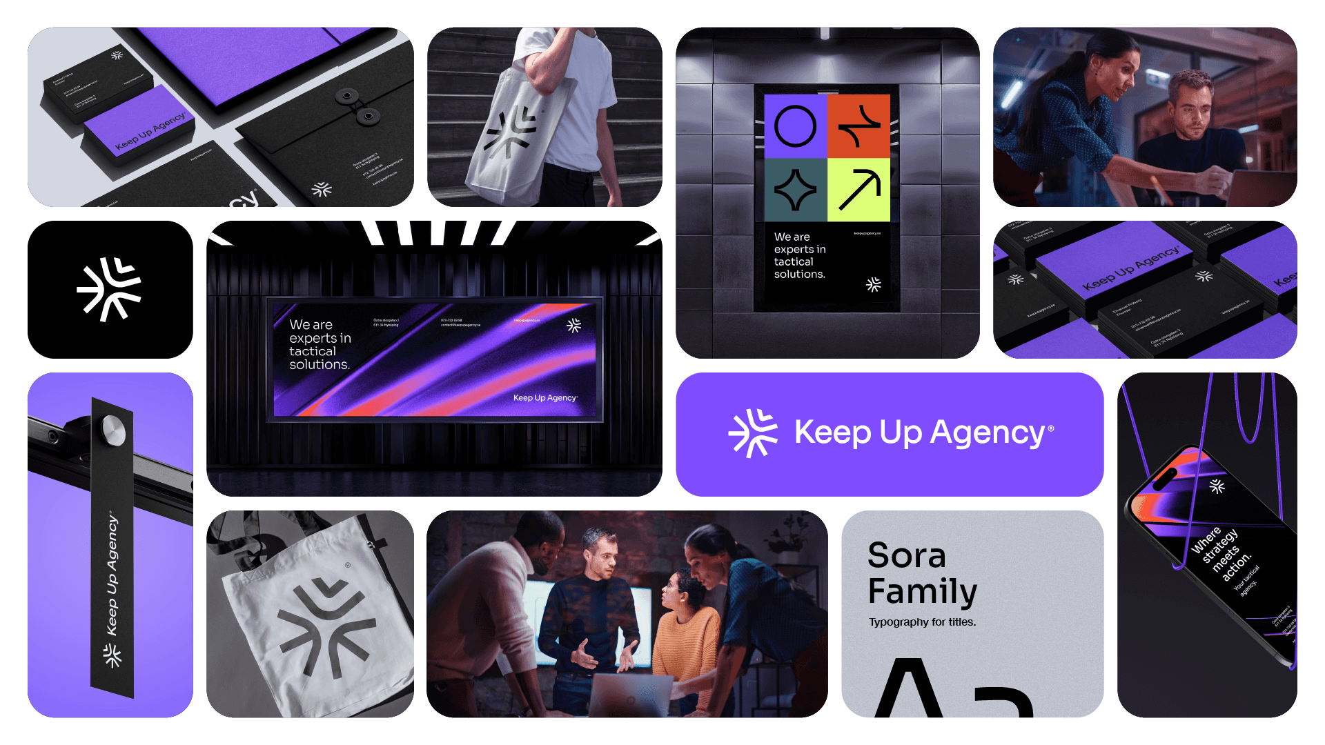 The color palette of Keep Up Agency was created to convey seriousness, energy and confidence. Black symbolizes the agency's seriousness and professionality, while orange and purple exude energy and dynamism. Green, in turn, represents confidence and growth, creating a vibrant and differentiated visual identity in the market. The choice of sans-serif typography, Sora for titles and Haas Neue Grotesk for texts, guarantees clear and pleasant reading, in addition to adding a touch of modernity and timelessness to the visual identity of Keep Up Agency. These fonts perfectly balance elegance and functionality, reflecting the agency's strategic and creative approach.