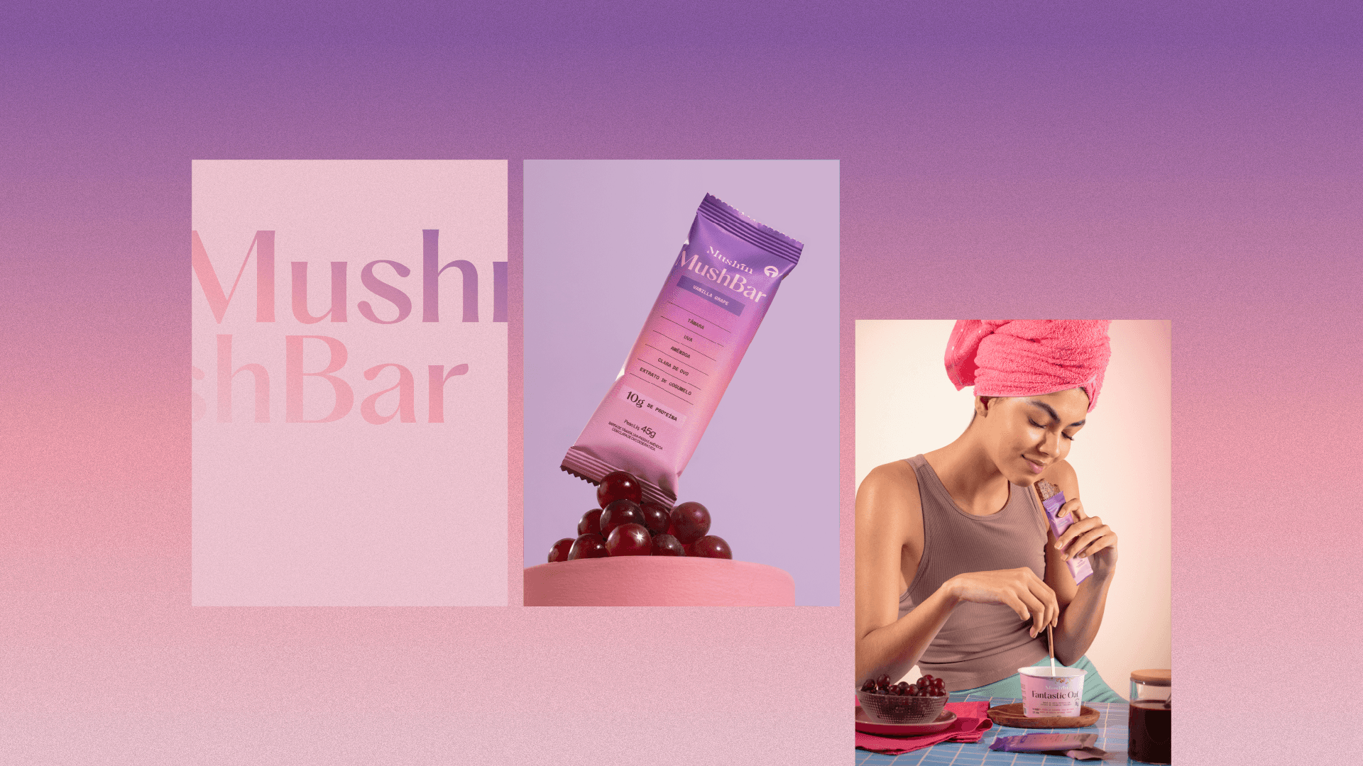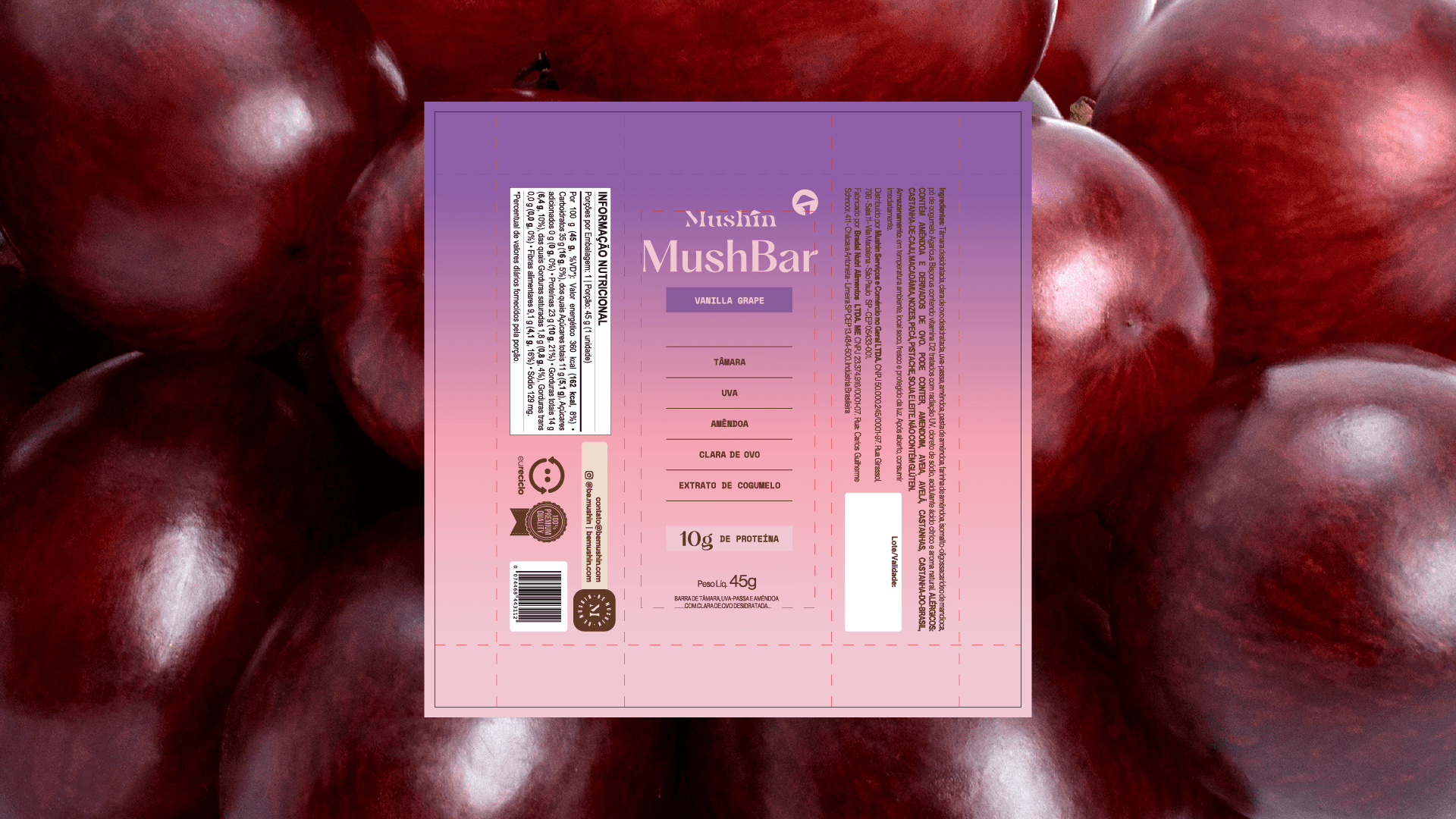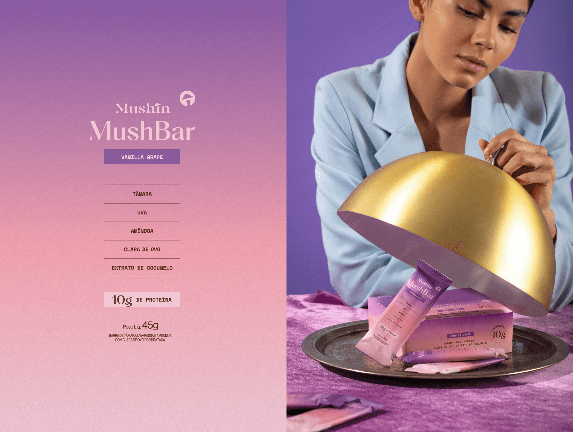 The packaging design follows the sophisticated and minimalist aesthetic of Mushin's identity, where the ingredients take center stage. This information layout ensures clarity in communicating the benefits of MushBar and visual alignment with the other products in the brand's portfolio.