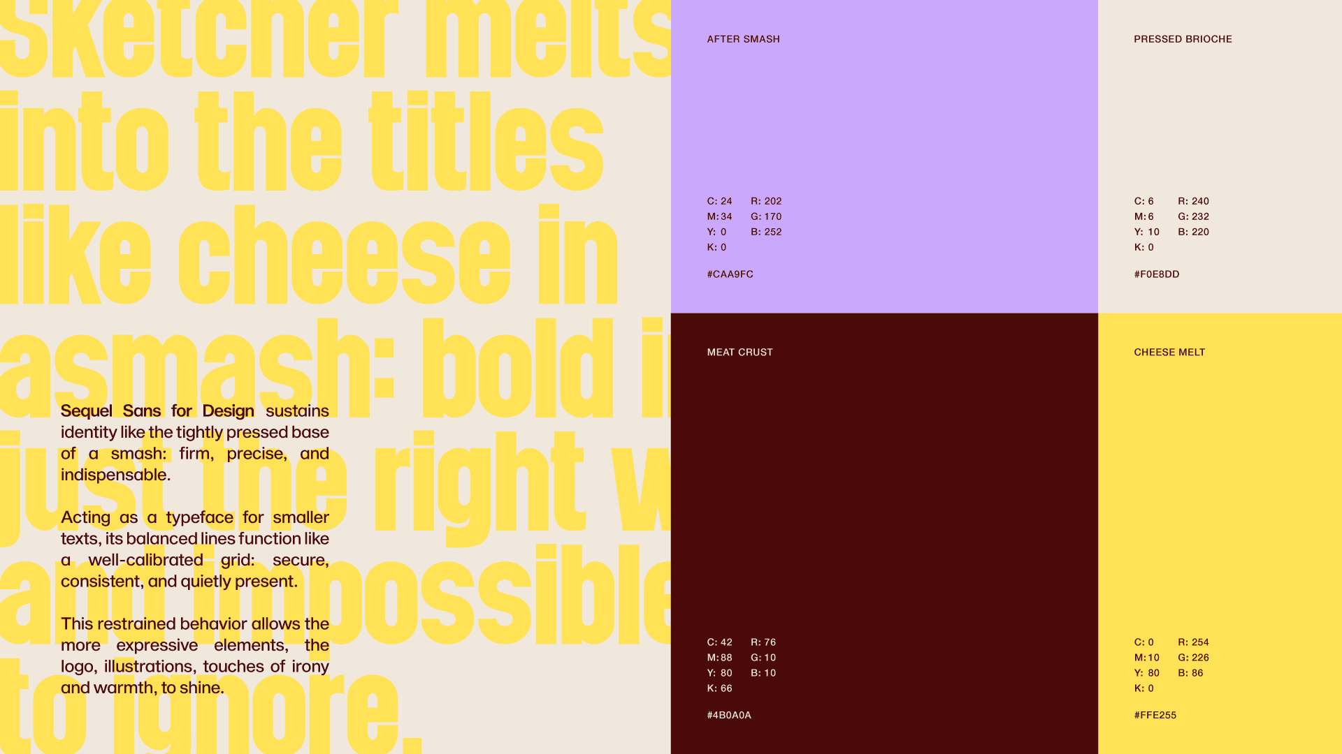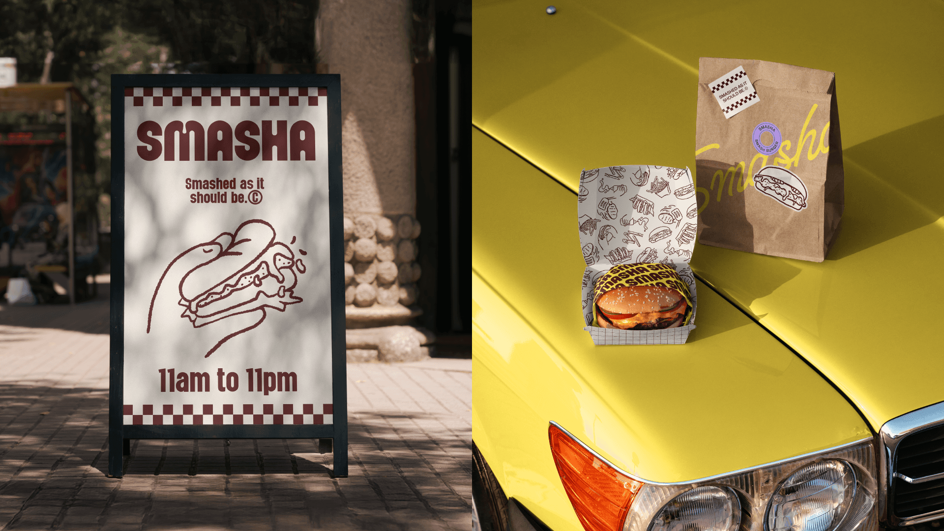 The color palette combines a warm off-white, reminiscent of bread and the neutral base of the experience, with deep, muted tones that evoke fire, grilled meat, and crispness, balanced by vibrant accent colors used intentionally. This contrast creates a contemporary, striking, and flexible identity, capable of being minimal and silent or expressive and bold, depending on the context. The graphic elements emerge from the typography itself and the gesture of pressing, unfolding into simple graphics, direct illustrations, and modular compositions. Applied to packaging, signage, and communication, they ensure consistency and personality to the visual system. As a whole, the SMASHA identity expresses a brand that understands smash as both a technique and a language.