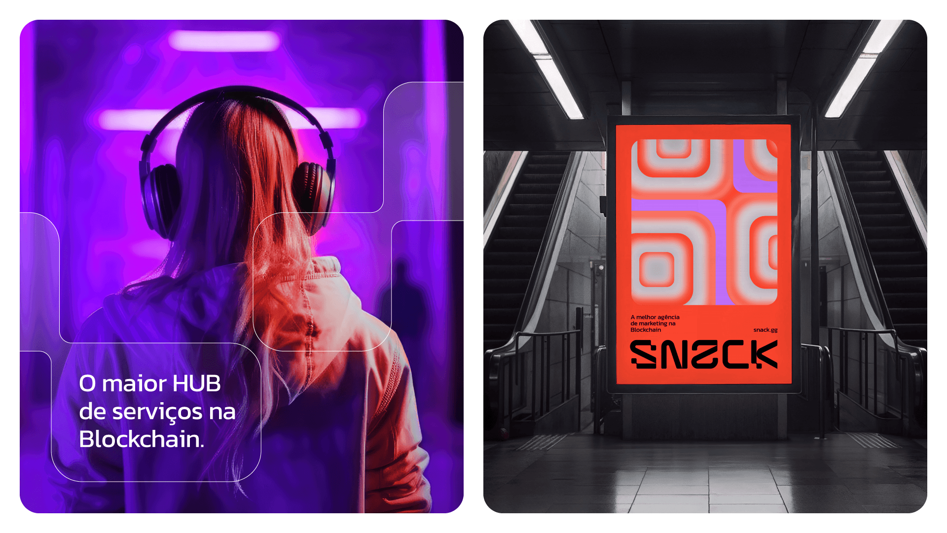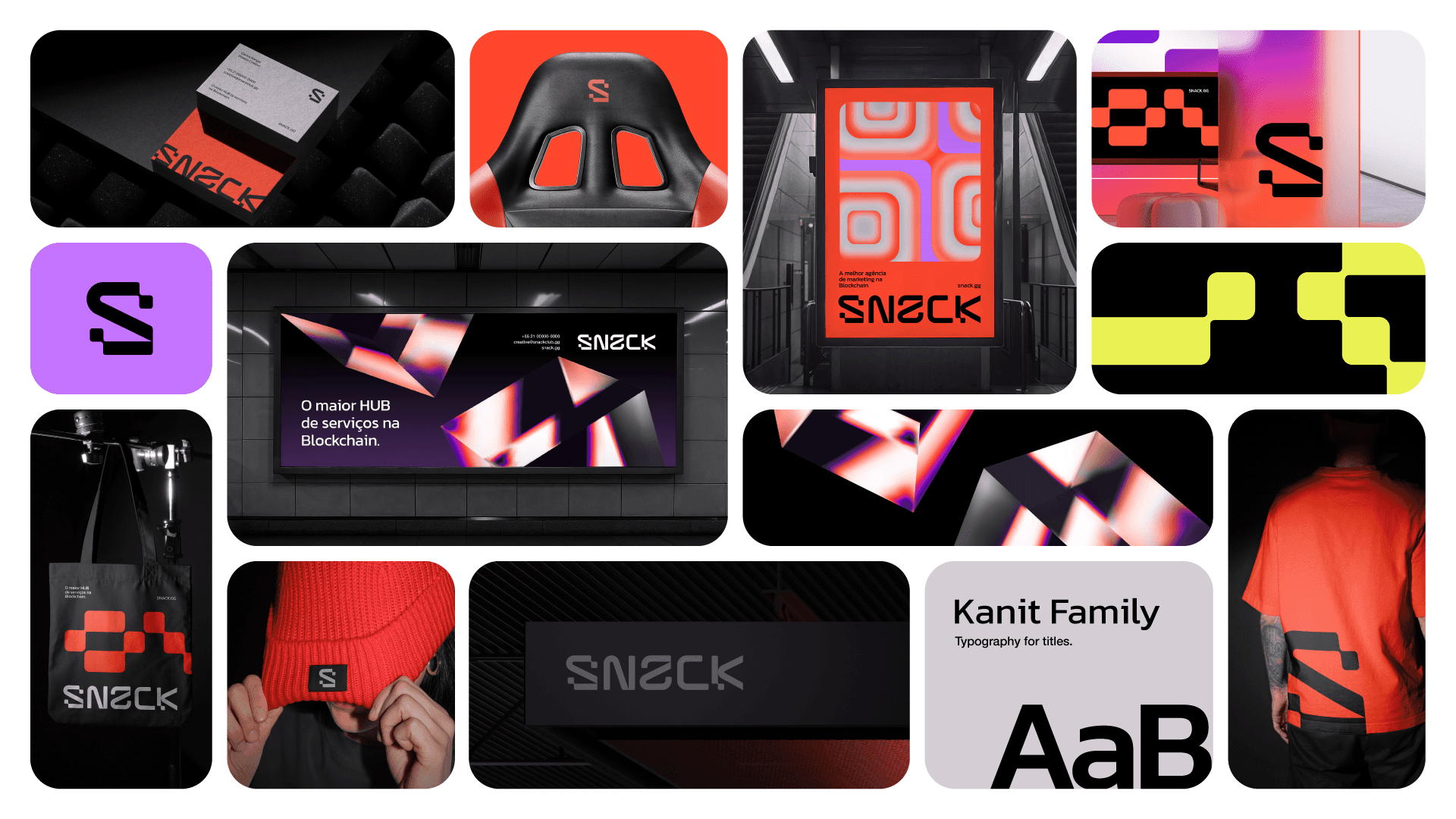 SNACK’s color palette was designed to evoke a sense of energy, innovation, and solidity. The intense red represents the brand’s passion and dynamism, while black adds a touch of sophistication and seriousness. Purple brings the idea of creativity and transformation, while citrus yellow injects vibrancy and optimism. Gray, in turn, creates visual balance, reinforcing the idea of stability and trust. The typography chosen for SNACK is a modern and personalized sans-serif, which ensures clear and striking reading in any context. Its geometric and minimalist shapes complement the other elements of the visual identity, ensuring that the brand stands out in a professional and contemporary way. In this way, SNACK’s logo, typography, and color palette communicate the brand’s core values. These elements reflect the brand’s commitment to offering cutting-edge solutions for the blockchain market, while establishing a strong, vibrant, and future-oriented visual presence.